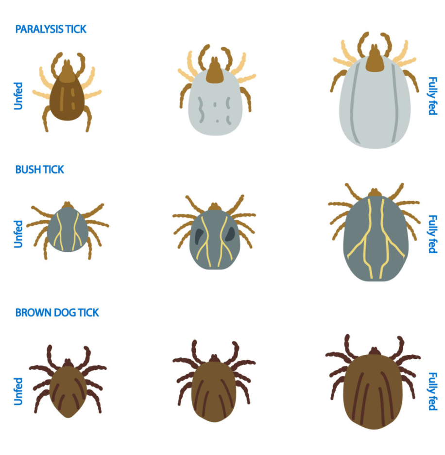 Paralysis ticks attach onto dogs and cats by sinking their mouth-parts into skin. The tick feeds on the host’s blood, injecting small amounts of toxic saliva into the animal, which causes weakness and ultimately paralysis.